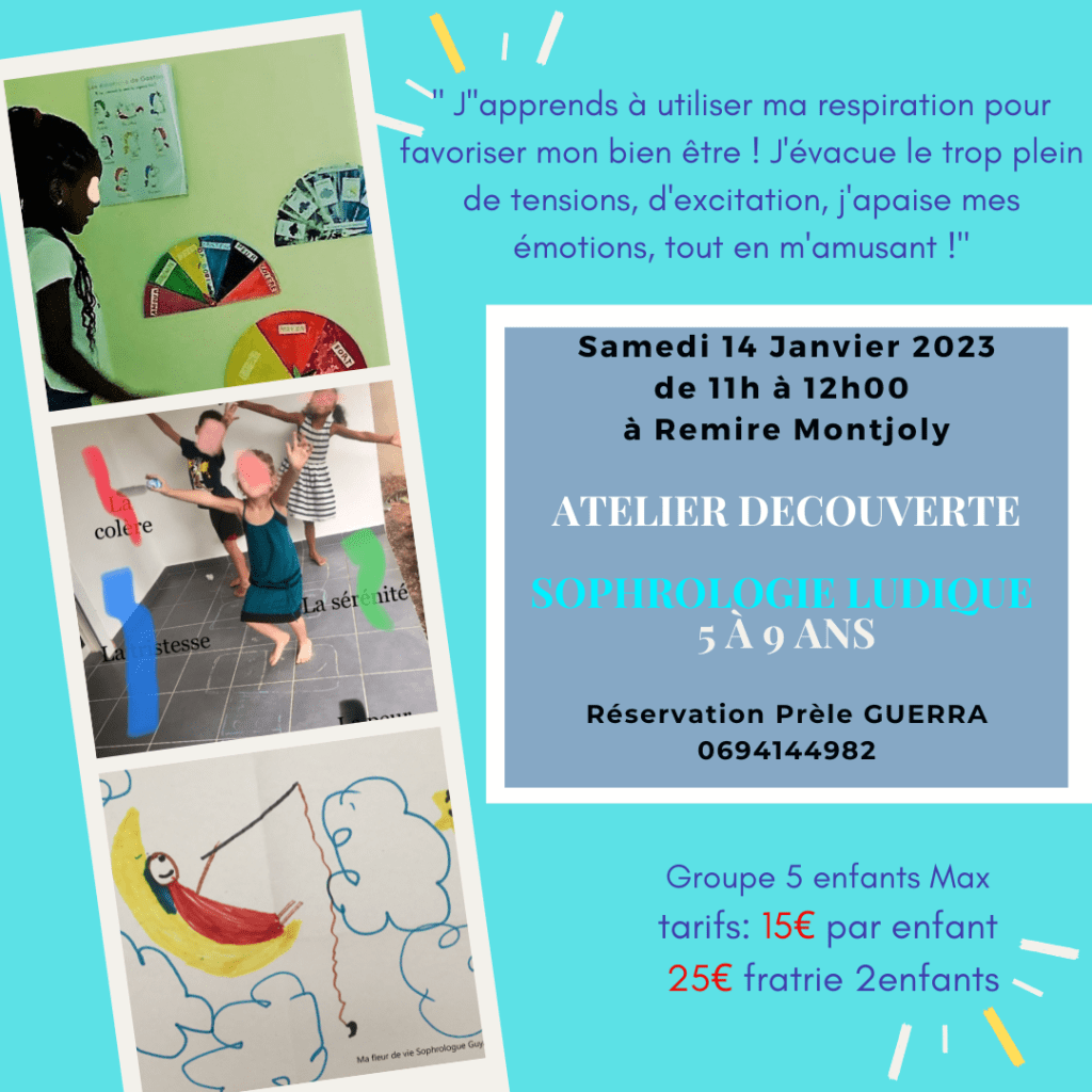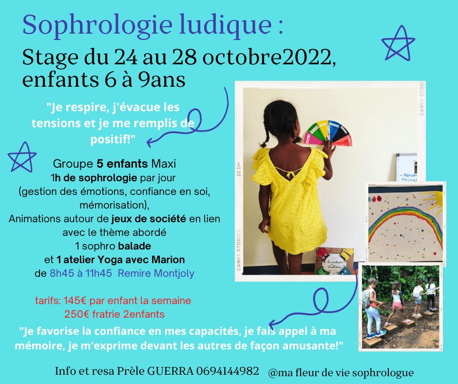 Bonjour à tous, je vous propose ce stage sophrologie ludique, 3ème session cette année! Les Ti Mouns sont contents de venir et selon le retour des familles, le bien être de leurs enfants se serait amélioré depuis, tant au quotidien, qu’à l’école (meilleure gestion des émotions, concentration, estime d’eux même, communication etc).